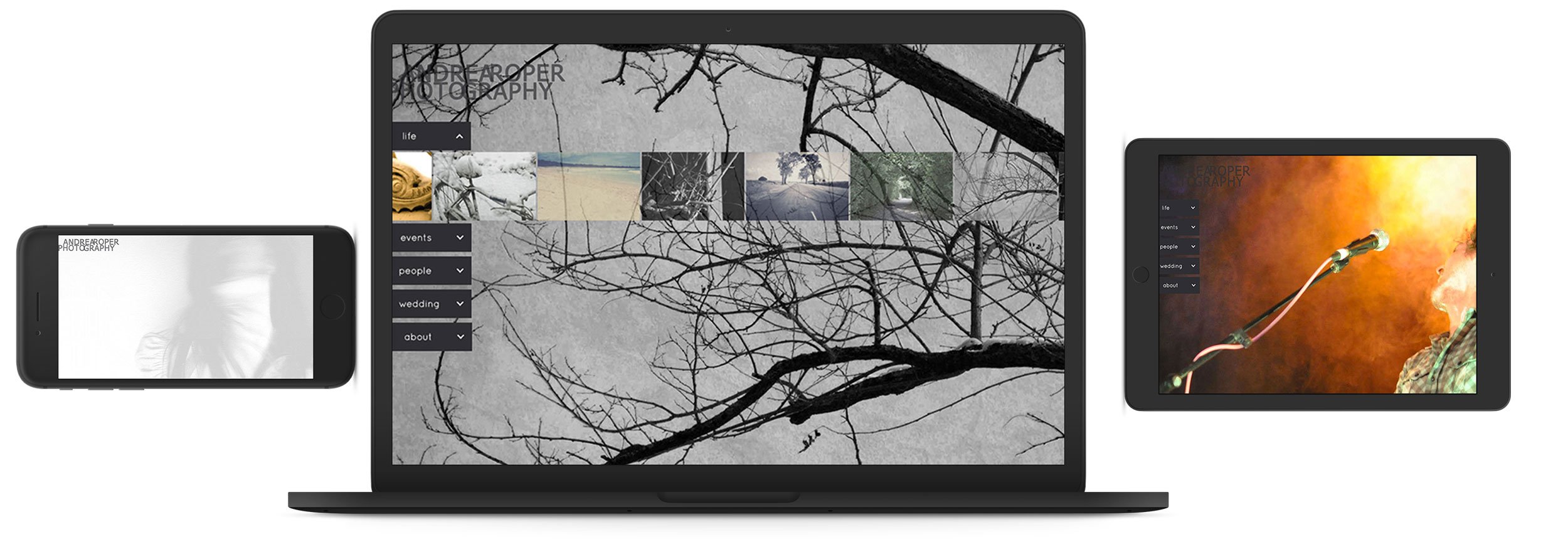 I opted to create a website that utilized a full-screen background gallery to make Andreas photos the focal point of the design. I coupled this with a simple sliding navigation system that provided easy access to content without interfering with the image on display.