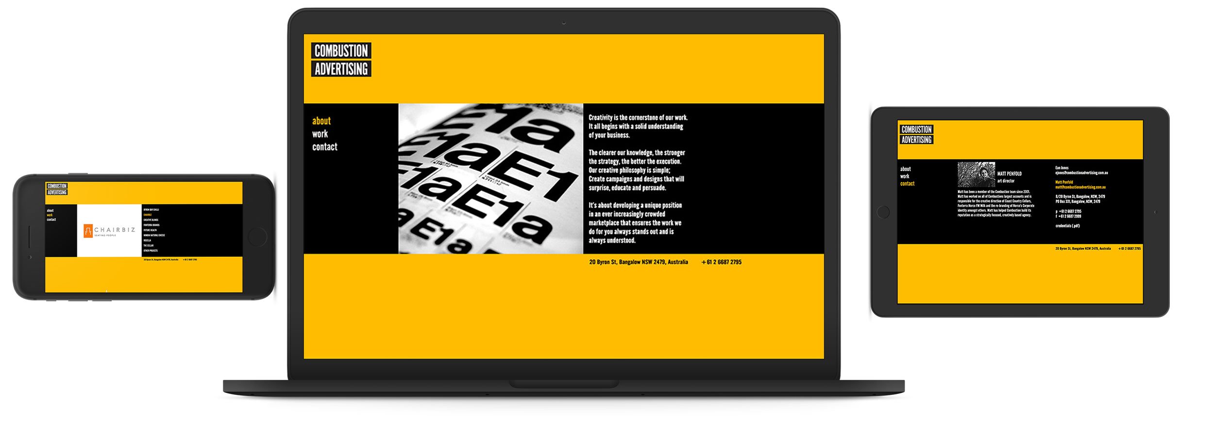 Combustion Advertising is an ad agency based on the North Coast of NSW. As one of the top ad agencies in the area, I am fortunate to have been given the opportunity to do some professional placement there. My task at the time was to create a new website design for the agency that integrated with their new branding.